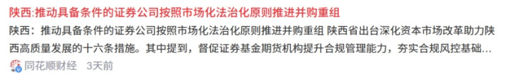 陕西:推动具备条件的证券公司按照市场化法治化原则推进并购重组;重点推动主业不突出、经营效益差的国有控股上市公司实施重大资产重。
