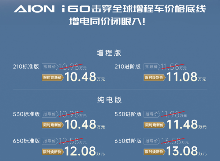 甚至,10.98万元这个入门价格,已经跟埃安自家的霸王龙一模一样,要知道,车身尺寸方面,霸王龙还停留在4.5米级别,而i60已经接近6.7米。而要是换做三年前,就连埃安Y卖的都比这个贵——足见,为扭转战局,这次埃安拿出了破釜沉舟的勇气。