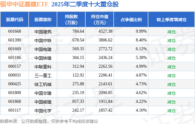 从基金规模来看,银华中证基建ETF基金2025年二季度公布的基金规模为4.53亿元,较上一期规模5.86亿元变化了-1.33亿元,环比变化了-22.74%。该基金最新一期资产配置为:股票占净值比98.18%,无债券类资产,现金占净值比1.88%。从基金持仓来看,该基金当季前十大股票仓位达57.42%,第一大重仓股为中国建筑(601668),持仓占比为9.99%。